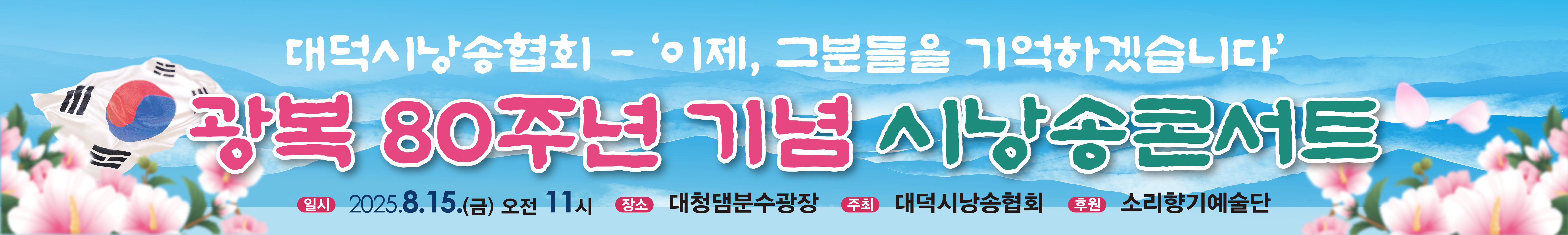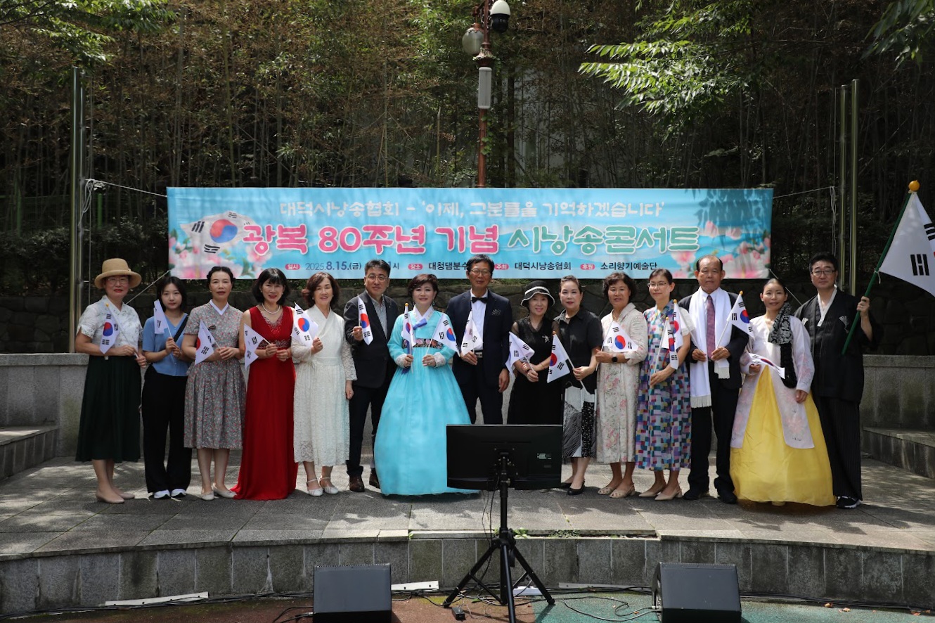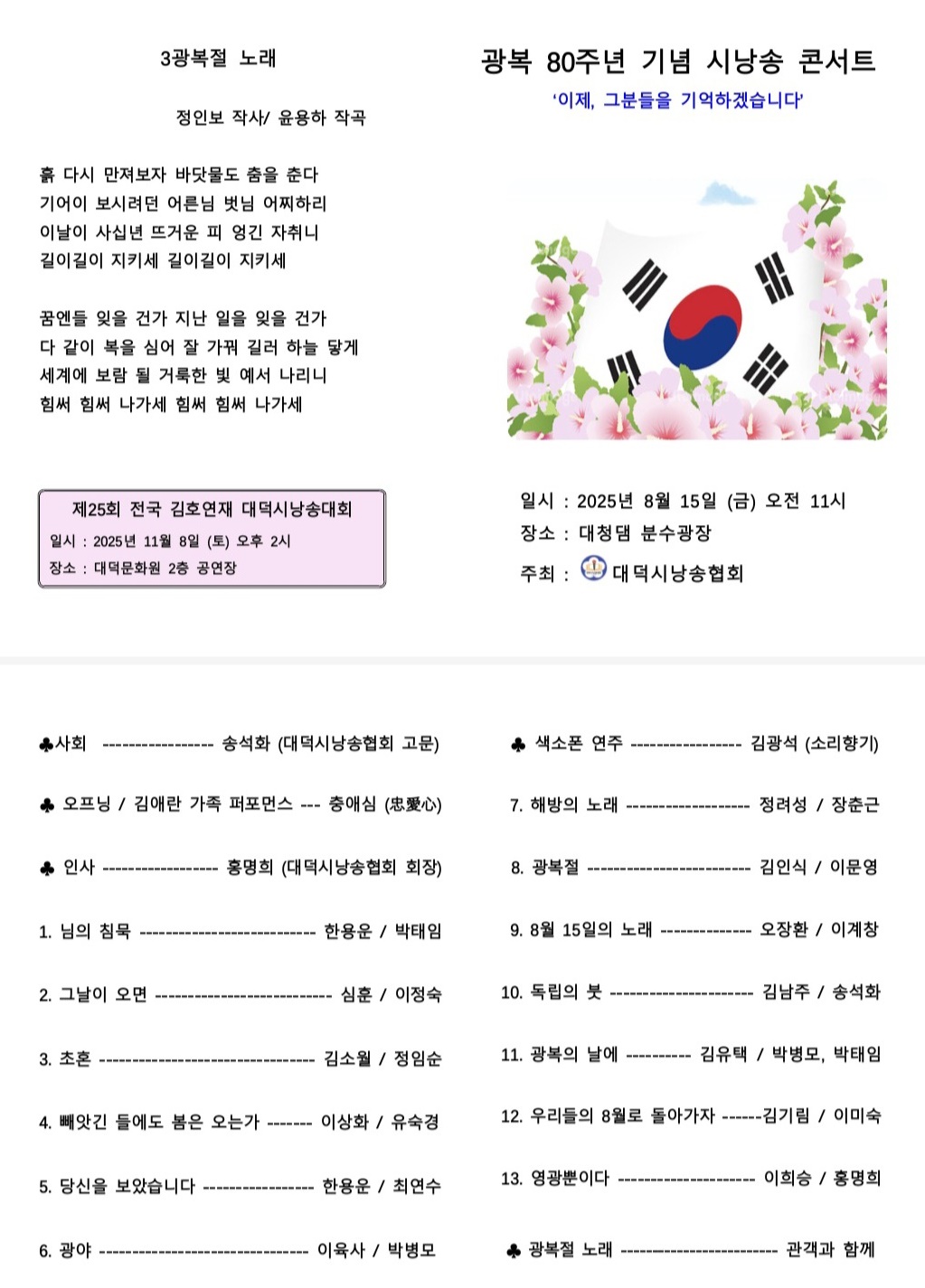 대덕시낭송협회에서 홍회장님의 기획으로 대청댐 분수광장에서 <광복 80주년 기념 시낭송 콘서트>를 진행하였다.