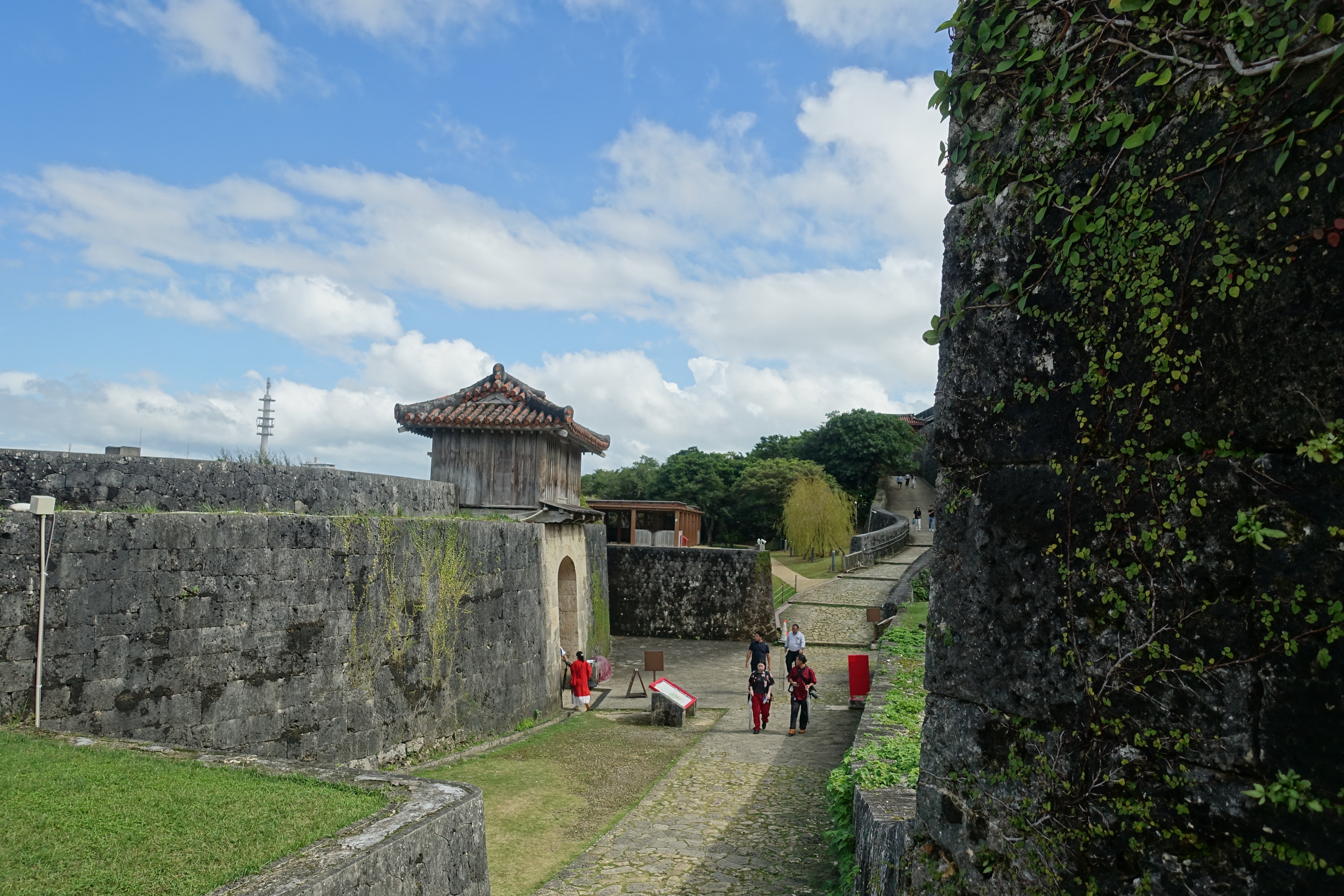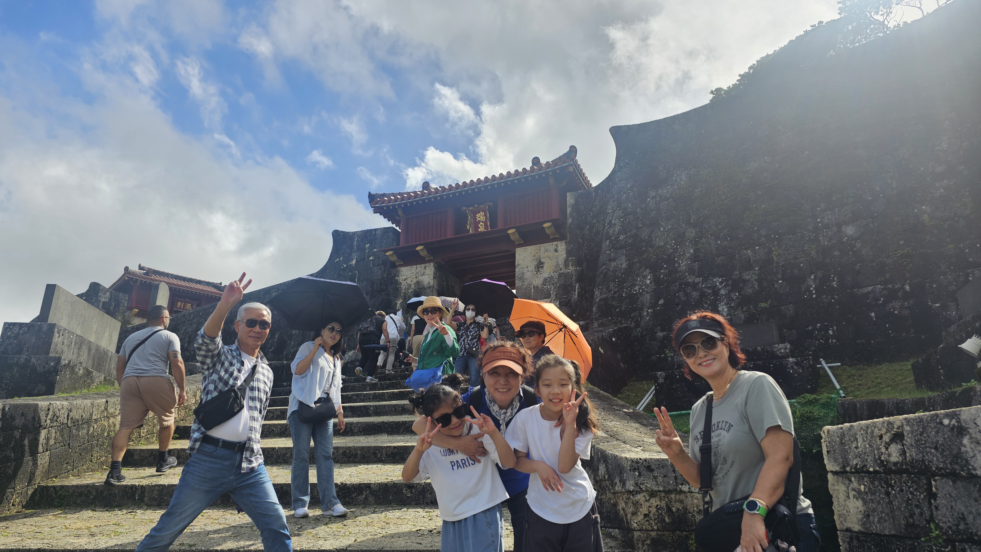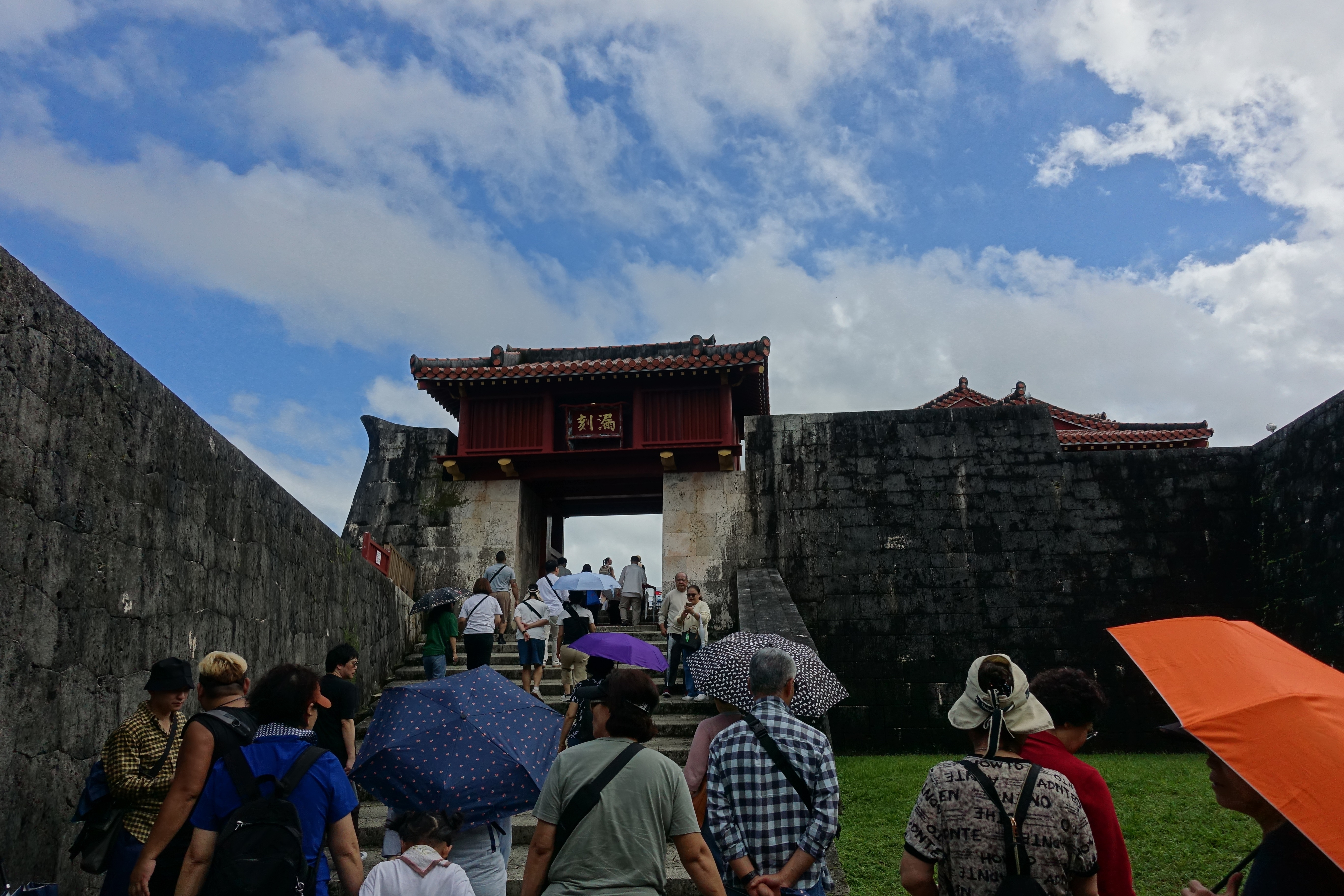 슈리성은 류큐왕국 시대이던 약 500년 전 지어져 1933년 국보로 지정되었으나 태평양전쟁 중 오키나와 전투로 소실되었다가 1992년 정전을 복구한 후 다른 건물도 잇따라 복원하였단다.