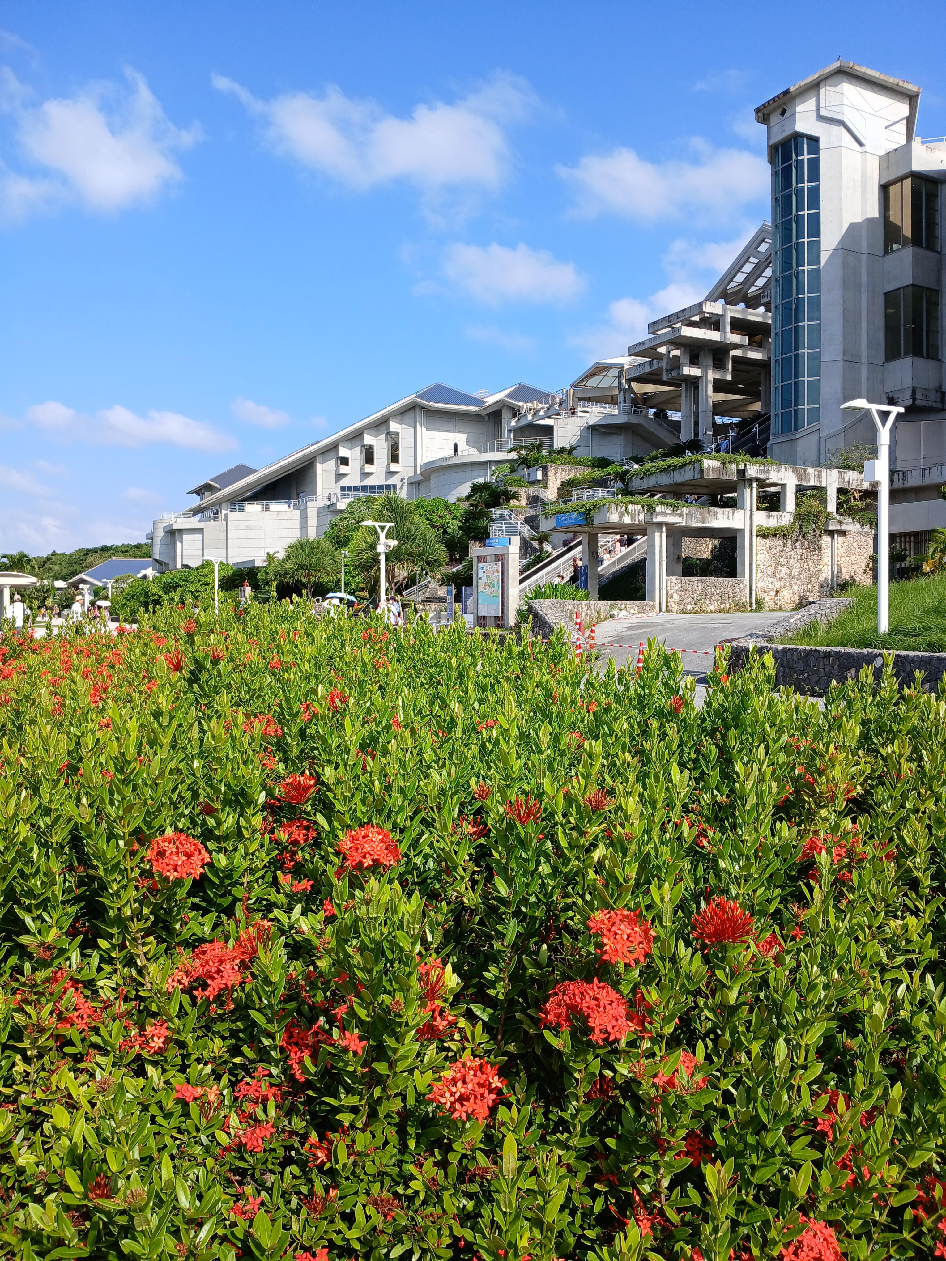 수족관 건물 정면에는 츄라우미 수족관의 대표 고래상어 대형 꽃화분과 만타가오리를 형상화한 건물이 멋스러웠다.