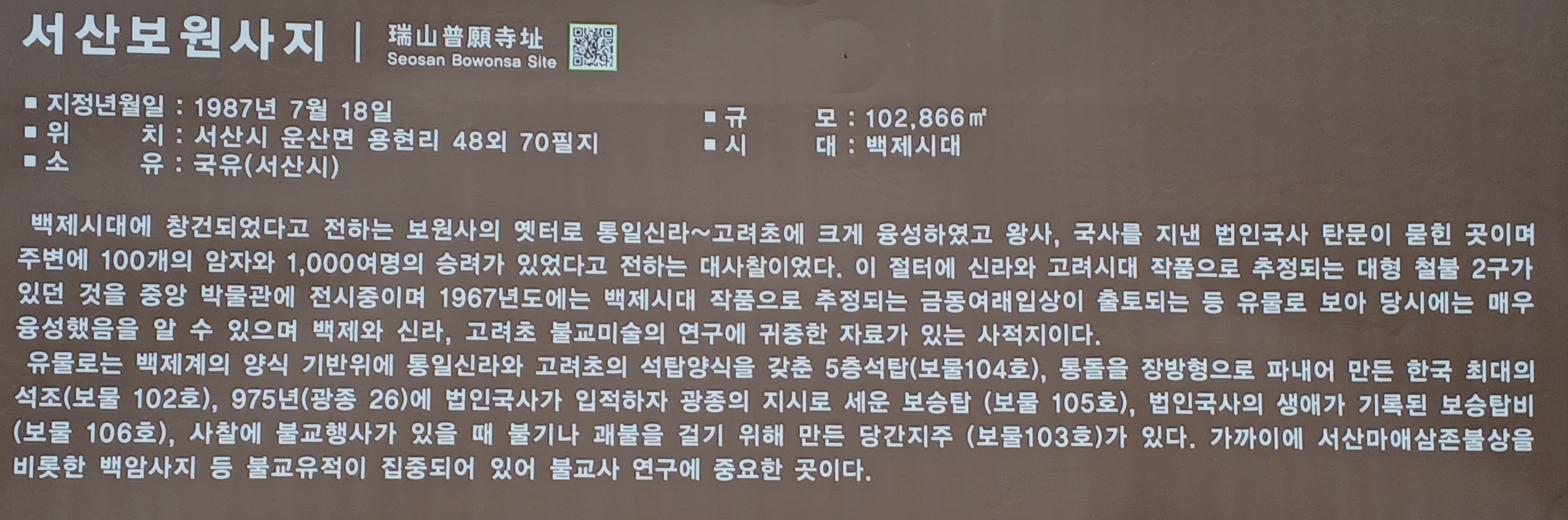 주변에 100개의 암자와 1,000여명의 승려가 있었다고 전하는 대사찰 보원사가 있던곳이다.
