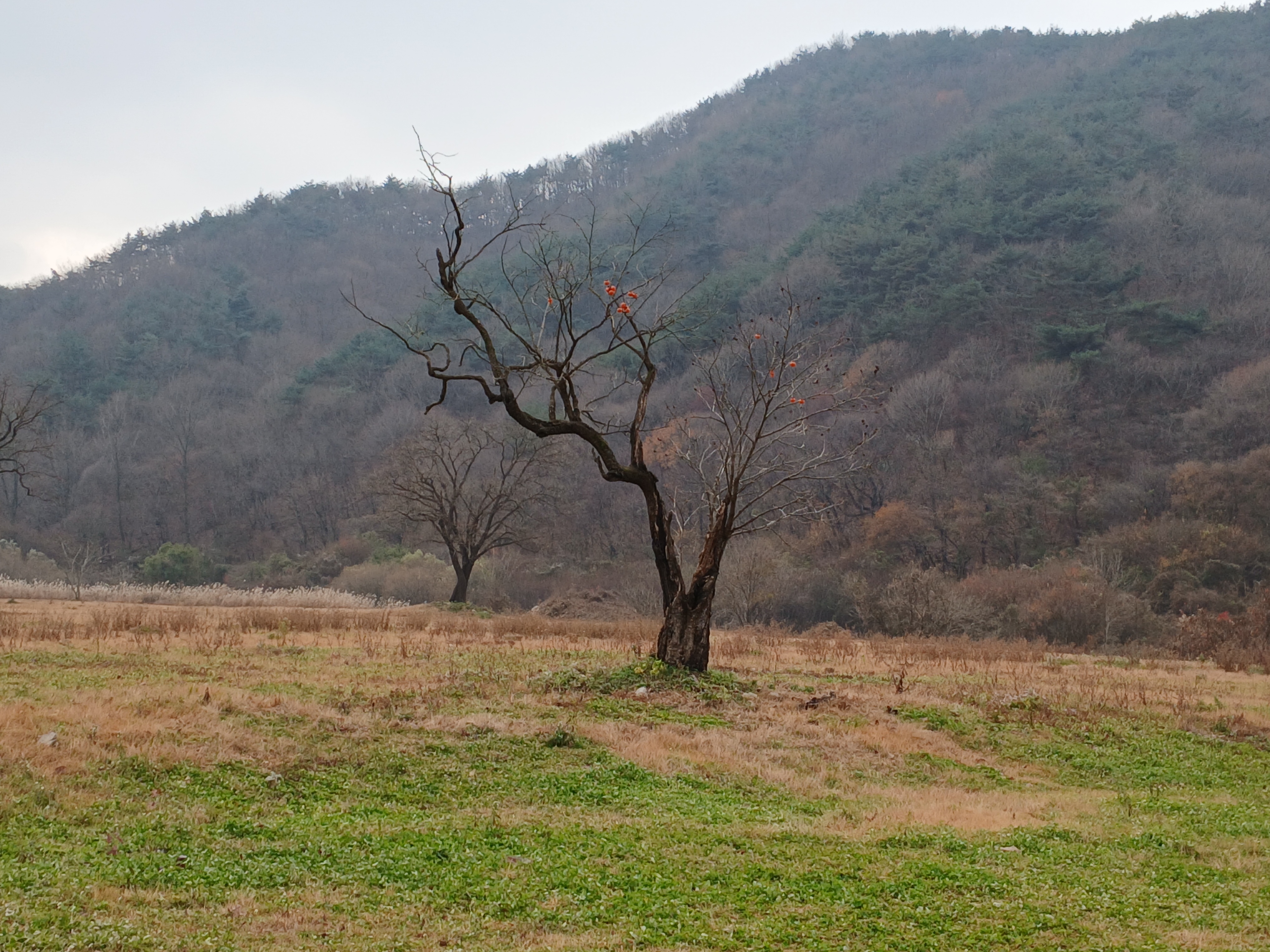넓은 벌판에 서있는 감나무에 까치밥이 매달려 있다.