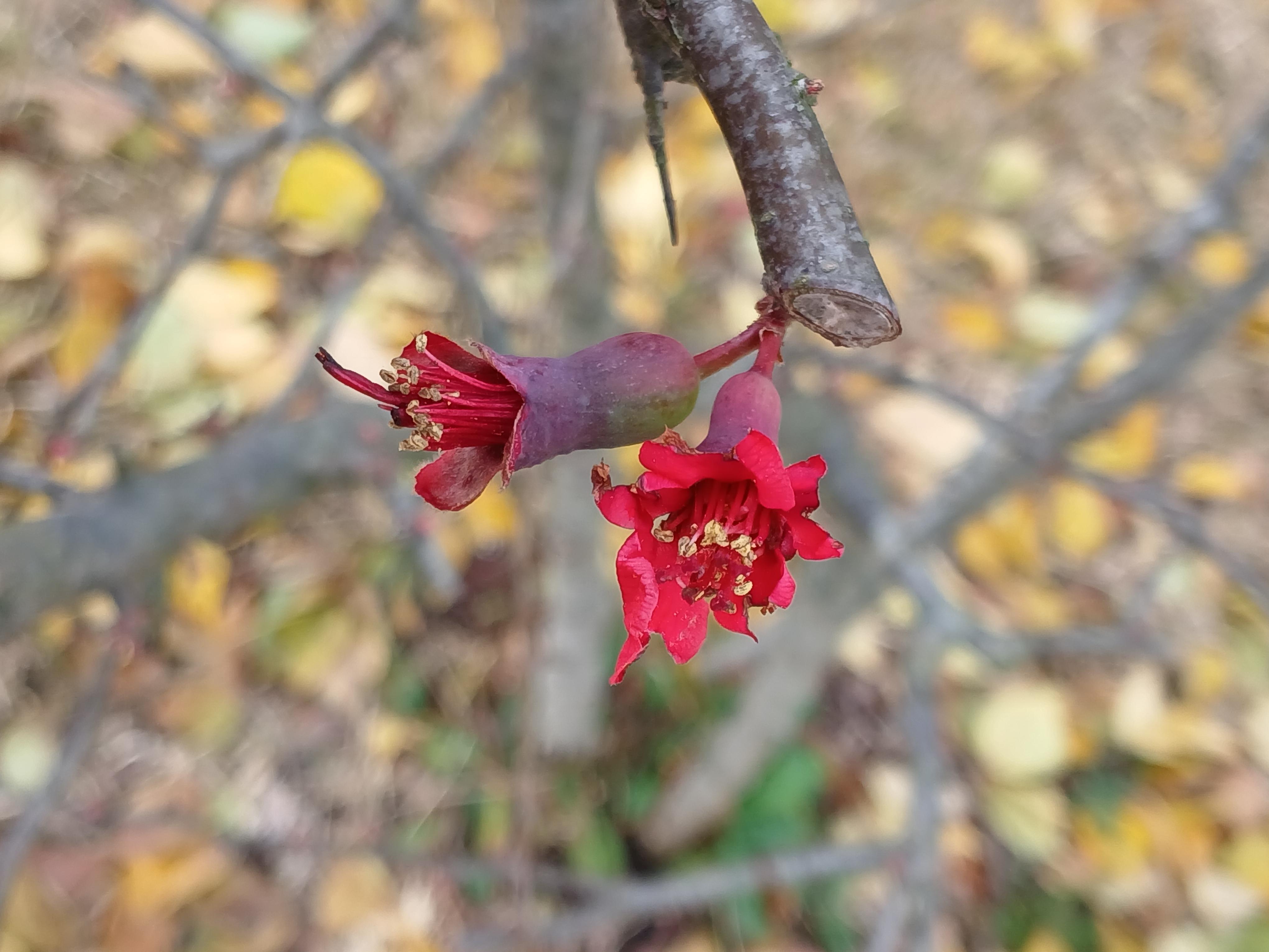 추사기념관 앞 조형물 앞에 있던 홍매화가 봄인줄 알고 꽃을 피웠다.