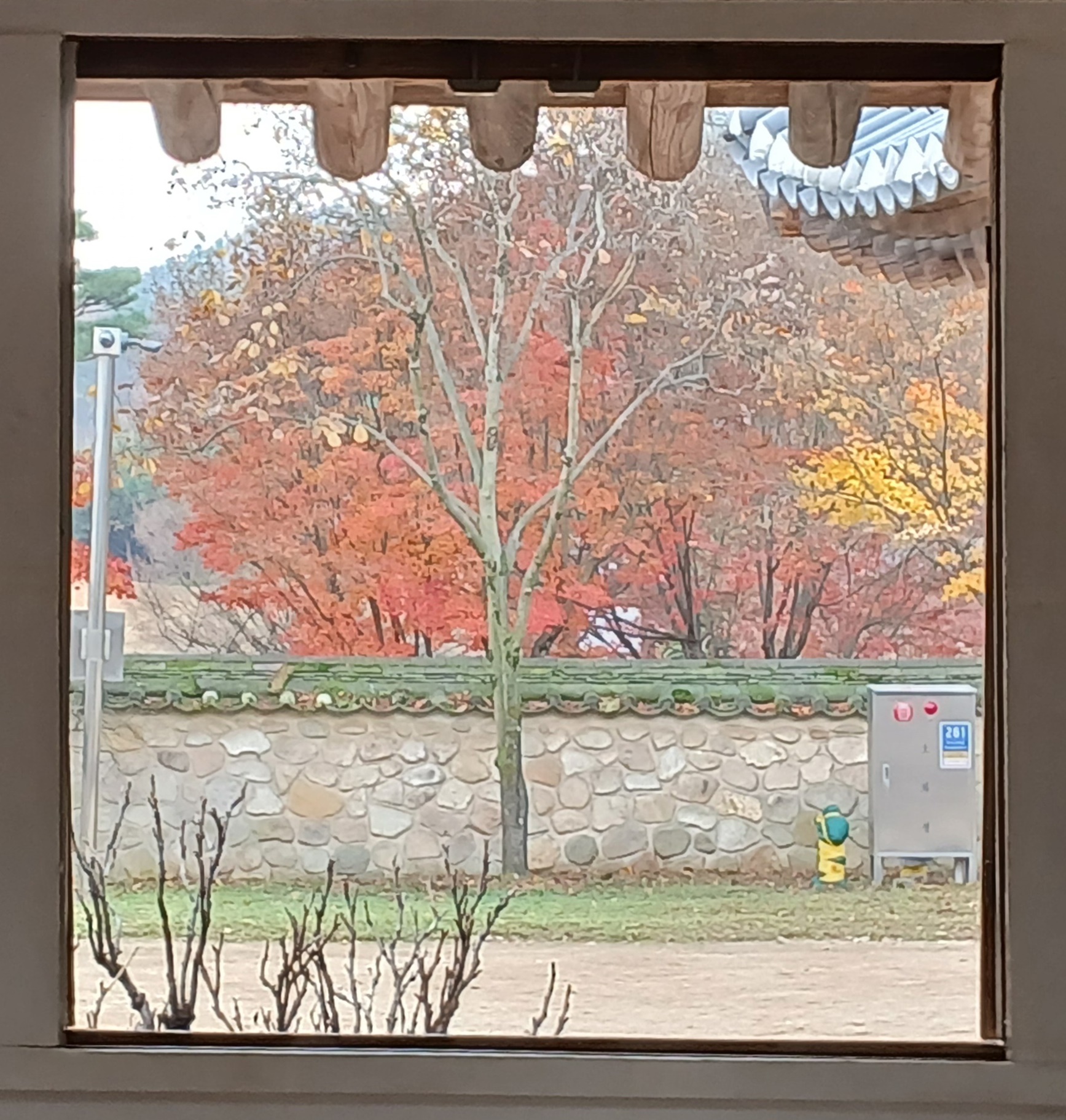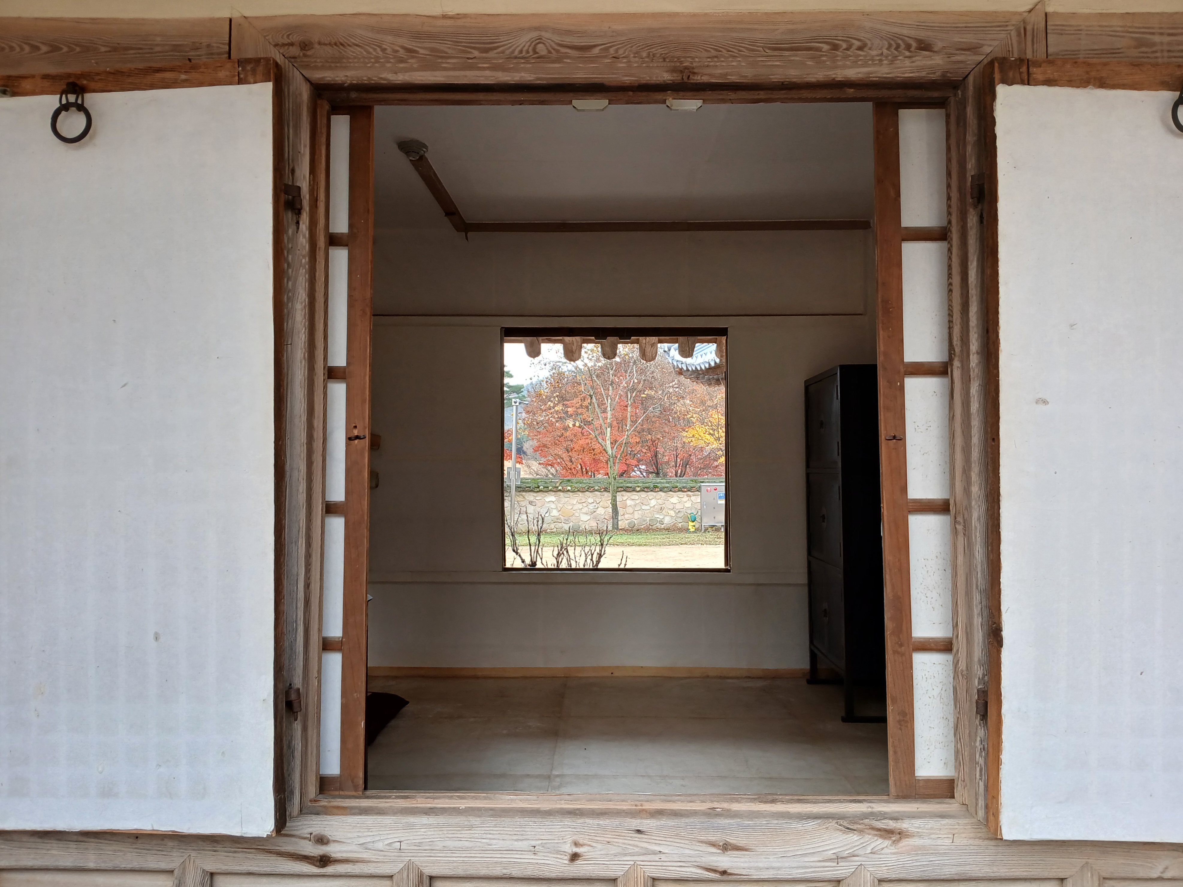사랑채 창문으로 보이는 바깥풍경이 멋스럽다.