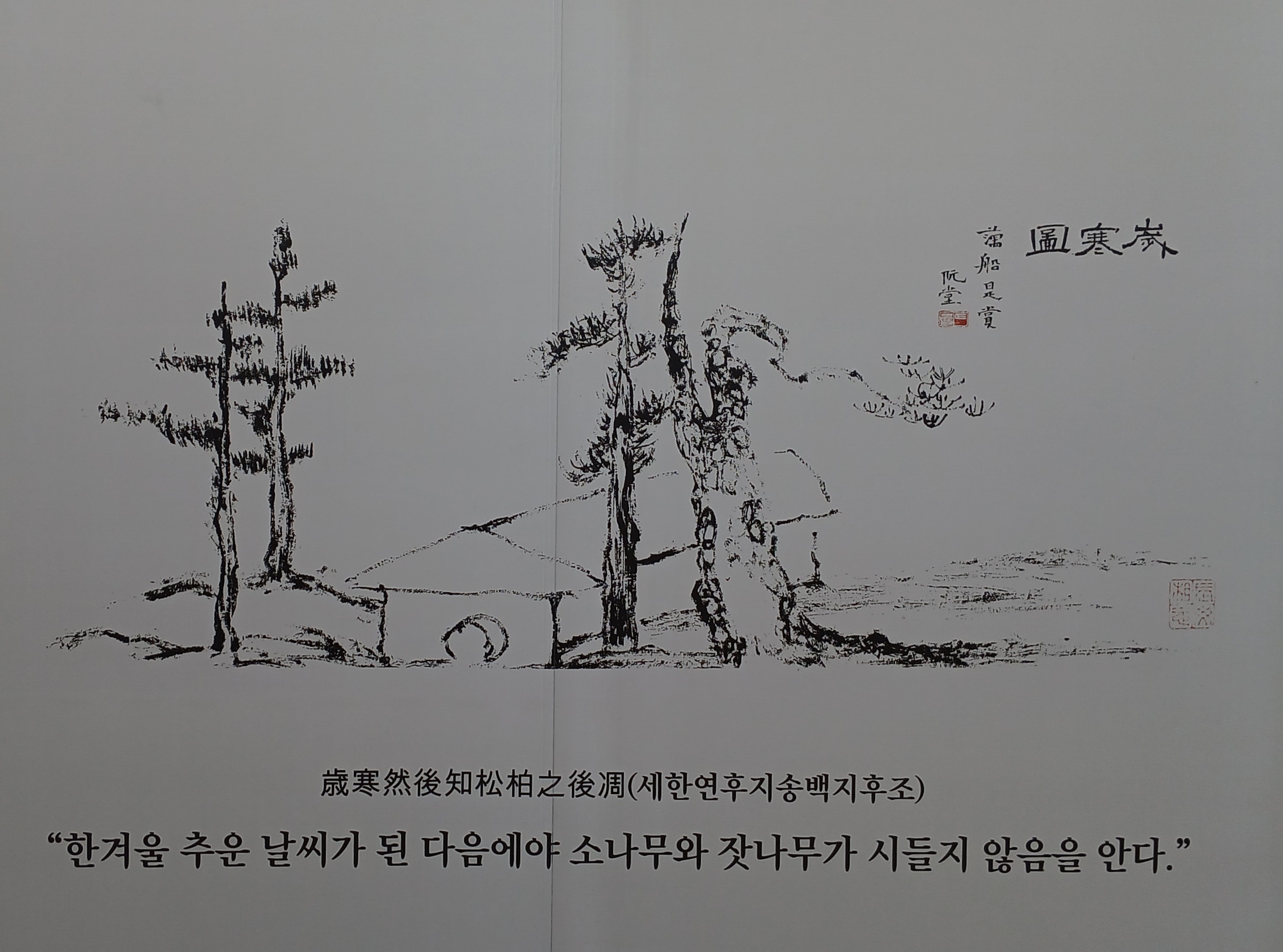 추사 김정희 선생이 제주 유배지에서 59세때 (1844년) 제자 이상적(1804~1865)에게 스승을 잊지 않고 귀한 책을 보내준 이상적의 인품을 소나무와 잣나무의 절개에 비유하여 그려준 세한도가 새겨진 표지석이 보였다.