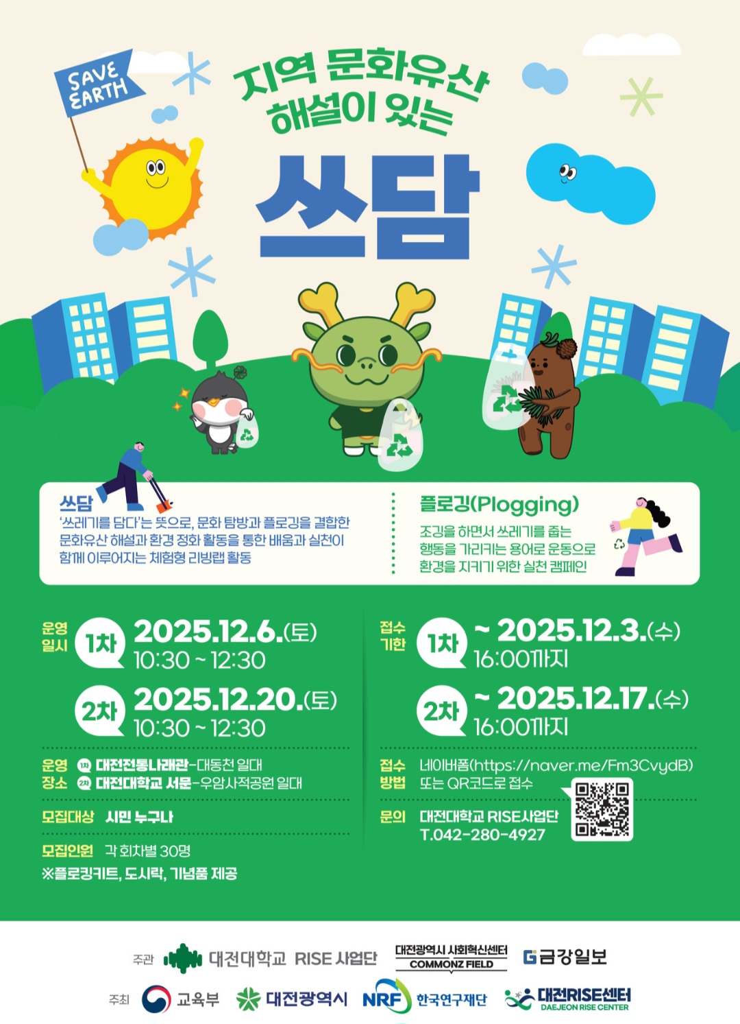 2025년 12월 6일(토) 대전대학교 RISE사업단에서 주관하는 <지역 문화유산 해설이 있는 쓰담>프로그램을 통하여 오전 10시 30분부터 2시간 동안 대전전통나래관도 둘러보고 대동천 일대에서 플로깅 활동도 하였다.